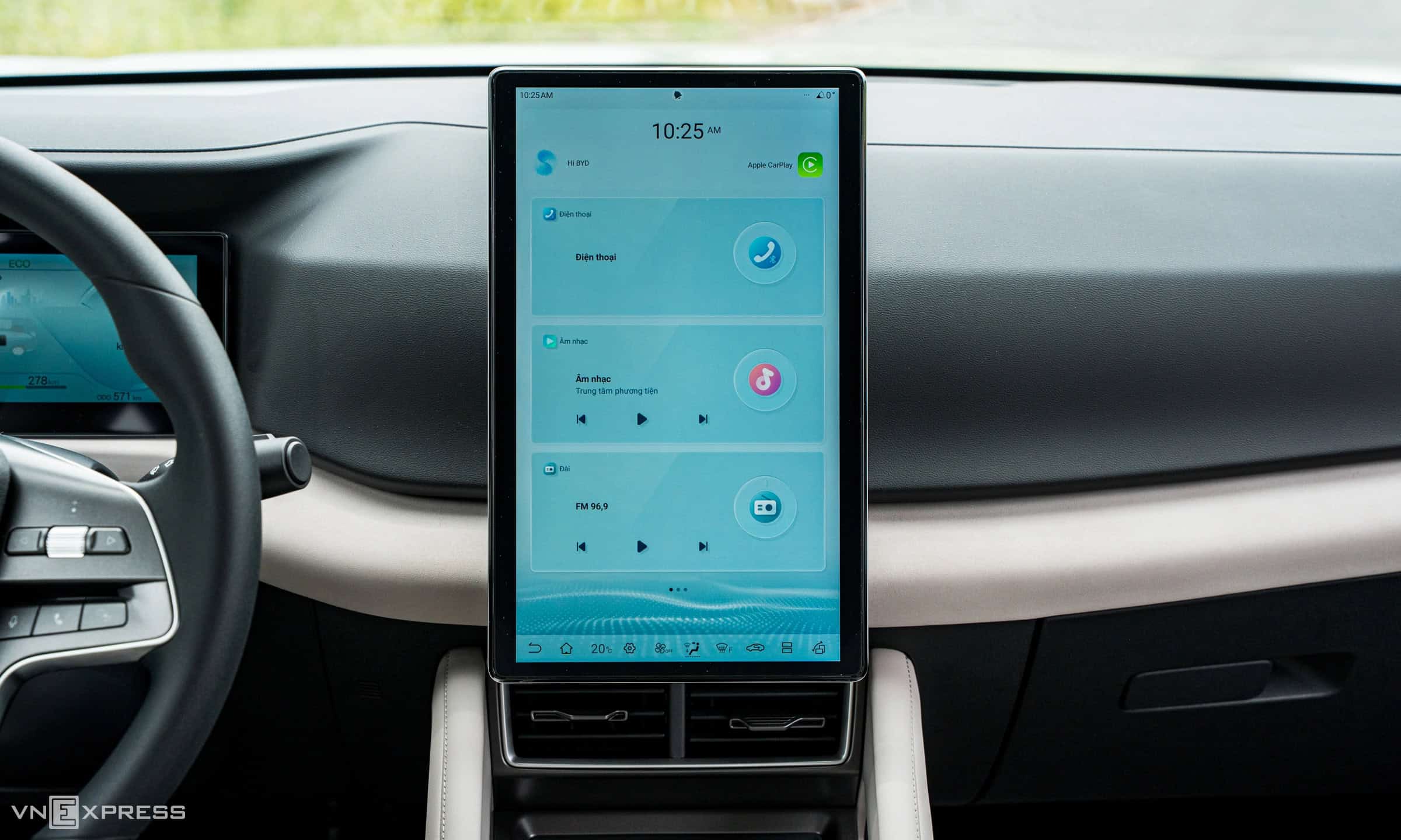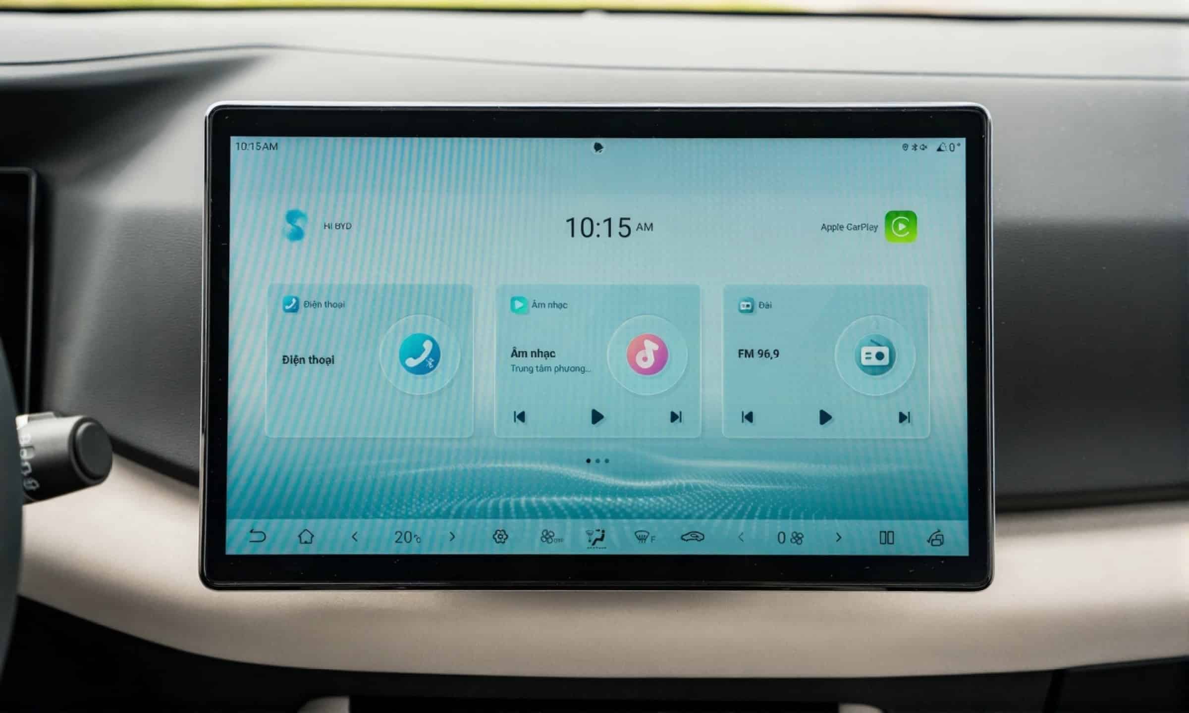 - Công nghệ giải trí: Tâm điểm là màn hình cảm ứng 12,8 inch có khả năng xoay ngang/dọc 90 độ đặc trưng của BYD, hỗ trợ kết nối Apple CarPlay/Android Auto không dây và điều khiển bằng giọng nói tiếng Việt tiện lợi.