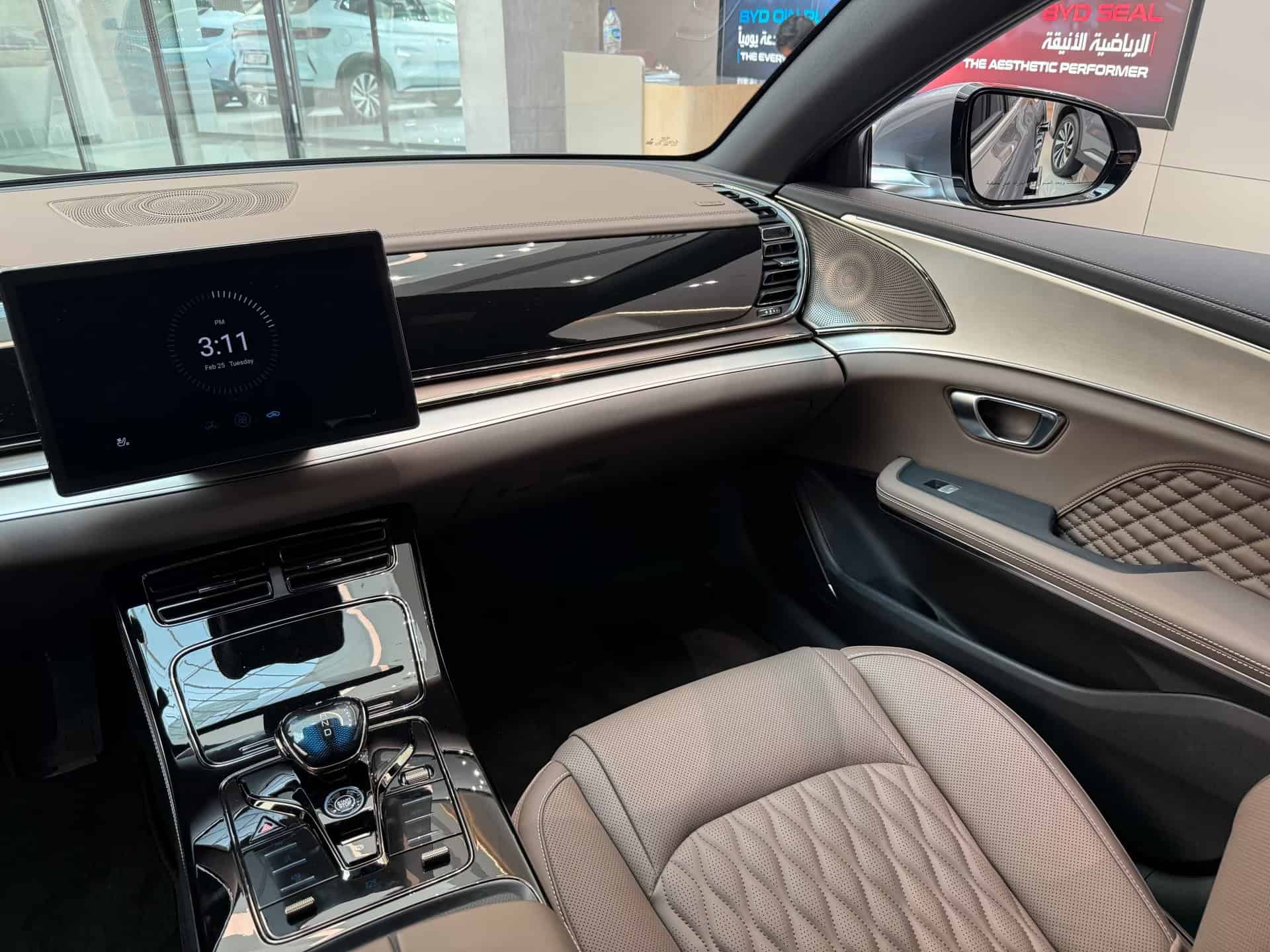BYD Han sở hữu nội thất hiện đại với chất liệu da Nappa cao cấp kết hợp nhựa mềm, carbon, kim loại và các chi tiết mạ crôm tinh tế. Vô-lăng hai chấu bọc da với logo BYD cách điệu mang đến cảm giác mới mẻ và sang trọng. Bảng táp-lô được trang bị màn hình giải trí kích thước lớn 15,6 inch có khả năng xoay ngang hoặc dọc tùy ý. Cửa gió điều hòa dạng nấc thang độc đáo cùng táp-bi cửa bọc da vân quả trám góp phần nâng cao sự sang trọng cho nội thất.
